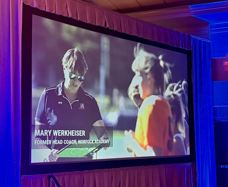 PHOTO: Former Norfolk Academy field hockey coach Mary Werkheiser, shown in projection at the NFHCA Hall of Fame induction ceremony (January 15, 2026). CREDIT: Norfolk Academy Athletics